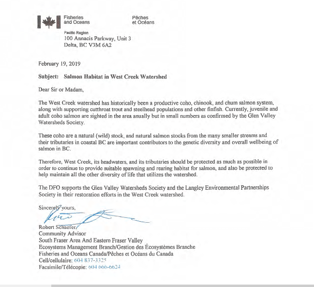 All of the local environmental groups, including the Langley Field Naturalists are aware that this development would diminish the natural value of the West Creek wetlands, would certainly have a negative impact on the habitat for the Coho salmon and would be a huge loss to the community as a whole in light of the value of wetlands in mitigating the negative effects of climate change. Many communities in BC and around the world are actively involved in creating or reestablishing wetlands because of their critical value in carbon capture and acting as heat sinks!