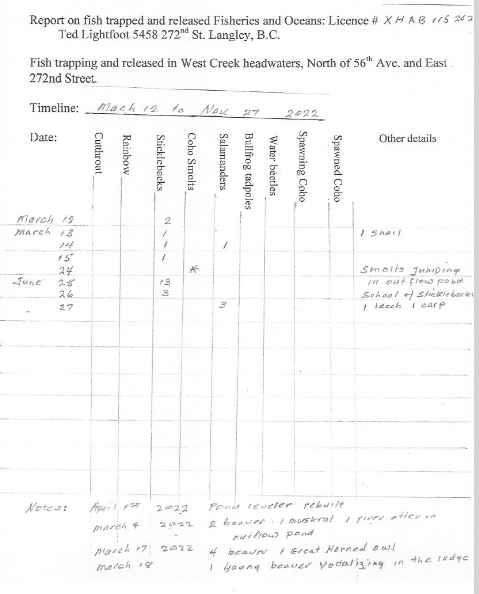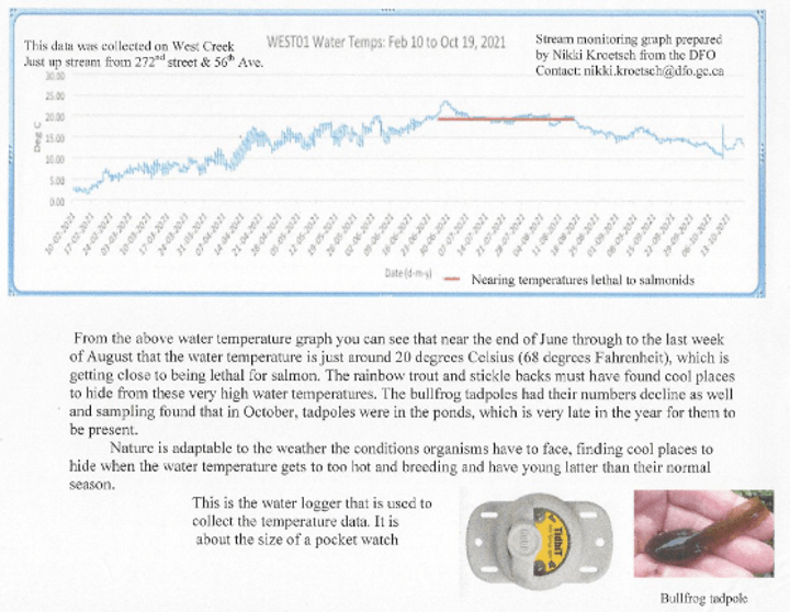 “Since its construction beaver activity has raised the water levels in the West Pond (Photograph 1) resulting in inundation of adjacent areas that have developed as wetland habitats. All of the constructed drainage features drain through the West Pond. West of 272 Street coho salmon have been observed upstream as far as Highway 1. All of the stream features in the Golf Curse Lands west of 272 Street are considered accessible to (if not also inhabited by) salmonids. Other fish species captured during instream works west of 272 Street include cutthroat trout, threespine stickleback, fathead minnow, brown bullhead, black crappie and largemouth bass.”