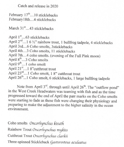 PHOTO OF WILD COHO SMELTS and POND LEVELER IMPROPERLY INSTALLED IN WEST CREEK HEADWATER COHO HABITAT