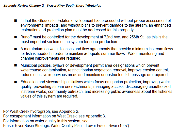 Ian Whyte is currently involved in the relocation and infilling of wild coho habitat at the West Creek headwater wetland in the role of the Lead Consultant of Beedie Development Group. Mr. Whyte has repeatedly proceeded with work prior to obtaining permits by senior governments. Mr Whyte’s report in this most recent proposal proves he has not engaged a fish biologist. Mr. Whyte is doing work that is beyond a P. Ag scope of practice. This is not the first time he has done so. He was found to be lacking in expertise of fish habitat protection required by a DFO Permit by the Supreme Court of BC.