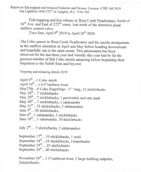 “Since its construction beaver activity has raised the water levels in the West Pond (Photograph 1) resulting in inundation of adjacent areas that have developed as wetland habitats. All of the constructed drainage features drain through the West Pond. West of 272 Street coho salmon have been observed upstream as far as Highway 1. All of the stream features in the Golf Curse Lands west of 272 Street are considered accessible to (if not also inhabited by) salmonids. Other fish species captured during instream works west of 272 Street include cutthroat trout, threespine stickleback, fathead minnow, brown bullhead, black crappie and largemouth bass.”