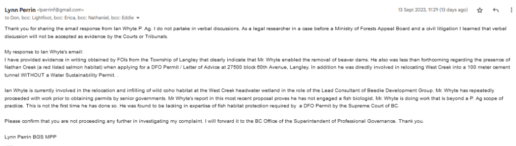 I have provided evidence in writing obtained by FOIs from the Township of Langley that clearly indicate that Mr. Whyte enabled the removal of beaver dams. He also was less than forthcoming regarding the presence of Nathan Creek (a red listed salmon habitat) when applying for a DFO Permit / Letter of Advice at 27500 block 60th Avenue, Langley. In addition he was directly involved in relocating West Creek into a 100 meter cement tunnel WITHOUT a Water Sustainability Permit. .