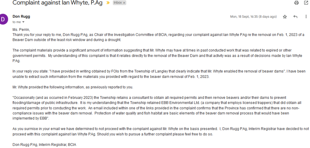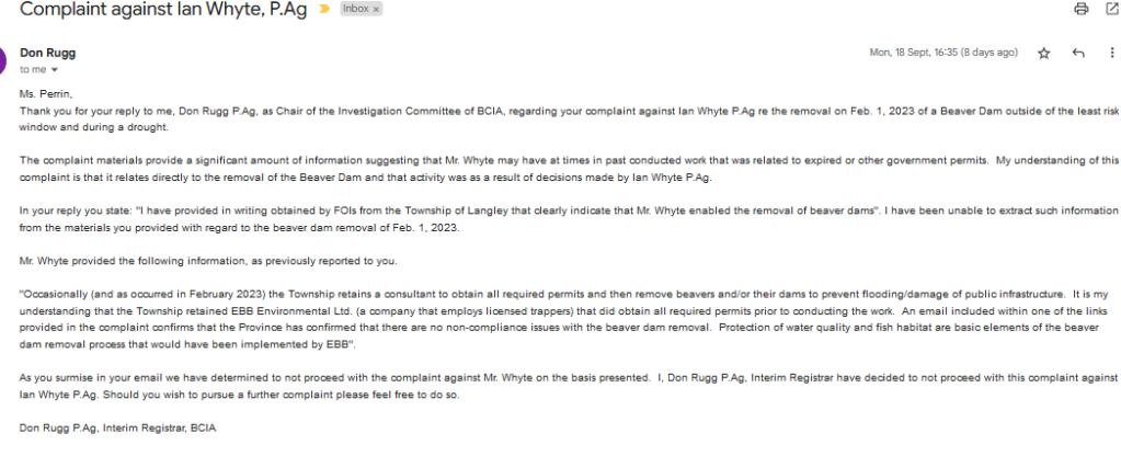 Thank you for your reply to me, Don Rugg P.Ag, as Chair of the Investigation Committee of BCIA, regarding your complaint against Ian Whyte P.Ag re the removal on Feb. 1, 2023 of a Beaver Dam outside of the least risk window and during a drought.
